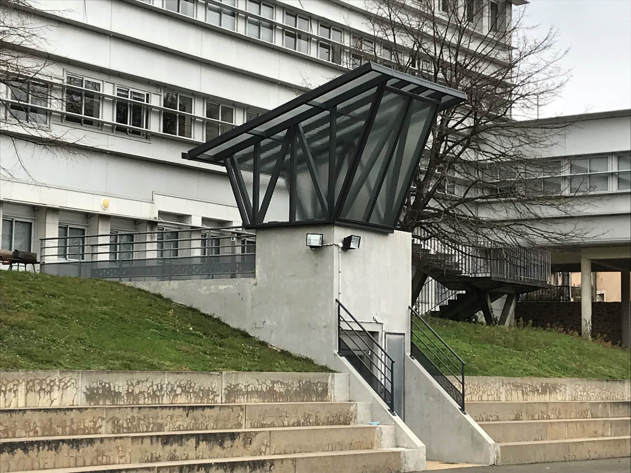 Fabrication d’un auvent en acier galvanisé et peint RAL 7016 (gris anthracite) pour protection ascenseur.